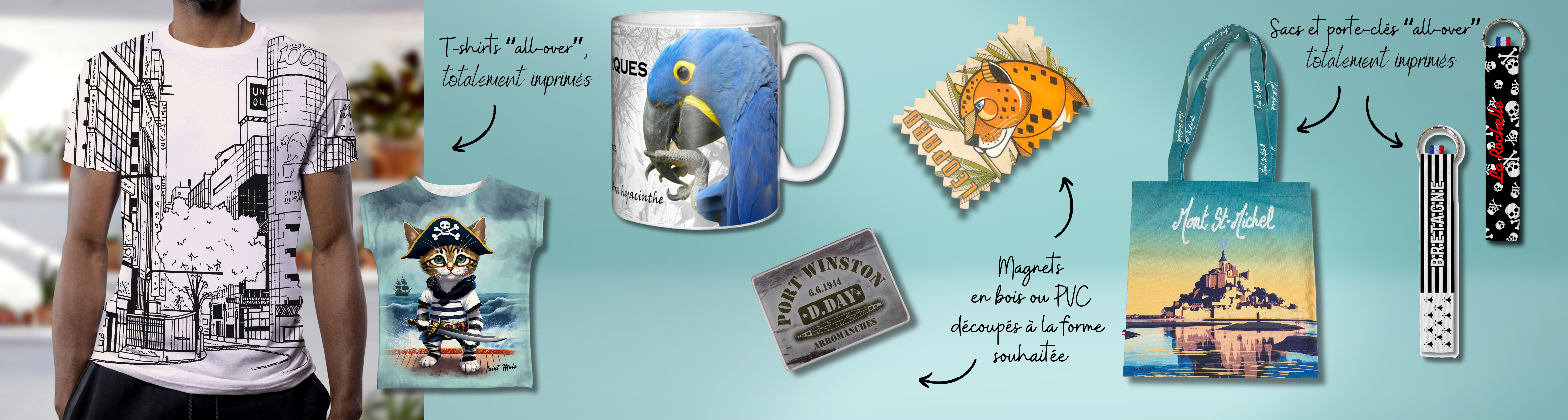Nous créons des collections de t-shirts, sweatshirts, casquettes, sacs, porte-clés, mugs... par thématiques. Ces collections sont disponibles sur commande à la pièce près pour les boutiques souvenir de chaque région de France, les parcs zoologiques, les parcs d'attraction, les aquariums et tout autre site de tourisme et loisirs.