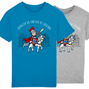 T-shirt enfant bio Chevalier du Château de Cheverny + transfert Epée et Casque en métal Azur 3/4 ans