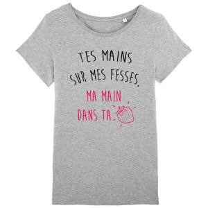 T-shirt femme bio Tes Mains sur Mes Fesses + transfert Paillette Fraise Heather Grey S