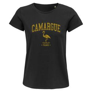 T-shirt femme Transfert Paillette (En Or sur T-shirt Noir) Camargue Flamant Noir Profond S