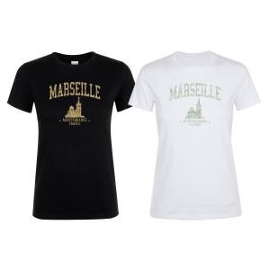 T-shirt femme Transfert Paillette Notre Dame de la Garde Marseille Méditerranée (Version Or) Blanc S