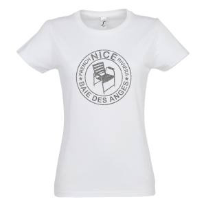 T-shirt fillette Transfert Paillette Chaise Nice Baie des Anges dans un Cercle Version Argent Rose O