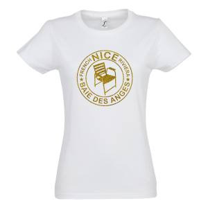 T-shirt fillette Transfert Paillette Chaise Nice Baie des Anges dans un Cercle Version Or Blanc 12 a